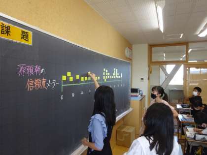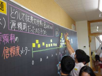 一通り学習を終え、今日は「源頼朝の信頼度」を基に学習を行いました。黒板にメーターをかき、ネームプレートを貼ります。源頼朝が行ったことや、そのことで変わっていった世の中について話し合い、源頼朝の功績や時代の様子を考えました。話合いの前と後でネームプレートを貼り替える子供もいました。歴史人物の行ったことについて活発に話し合うなど、学習に意欲的な子供たちでした。