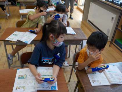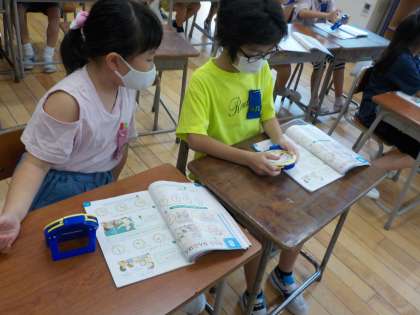 算数科の学習では、時計を操作しながらペアで「これは何時?」「これは何時半?」と問題を出し合ったり、「10時半にしてみよう」と時計の針を合わせたりしました。短い針と長い針を意識しながら、時計を正しく読んでいきました。