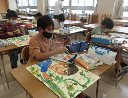 4年生の図画工作科「わたしとヘチマ」では、彩色の作業を行っています。