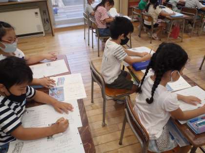 国語科では、「じどう車くらべ」の学習に取り組んでいます。穴埋めのワークシートを書いたり、「しごと」と「つくり」のシールを貼ったりすることで、同じ言葉が繰り返し出てくることに気付いたり、「問い」と「答え」を見付けたりして比べながら読んでいます。