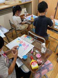 液体粘土に絵の具を混ぜ、手のひらや指で自由に絵を描いています。手で描くという初めての活動に、子供たちはとても楽しんでいる様子でした。