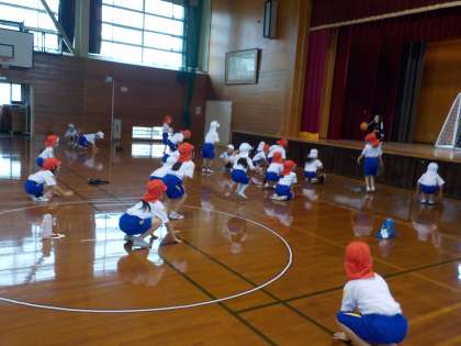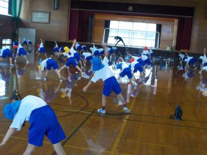 体育科では、表現運動に取り組んでいます。例えば、木になりきって春夏秋冬を表現したり、ボールになりきってはねたり転がったりしました。夢中になって表現を楽しむ子供たちでした。