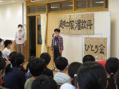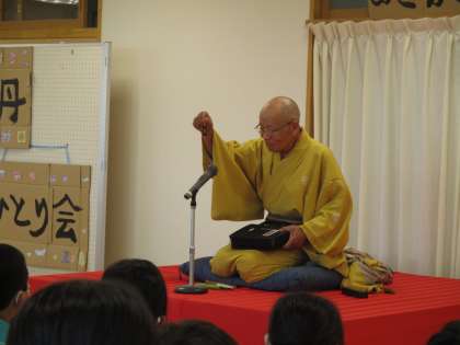 越中家漫欽丹さんをお招きして、落語会を開きました。初めて生で落語を見ることができ、「落ち」の面白さを感じていました。落語だけでなく、ハーモニカの演奏を聴かせていただいたり、健康で長生きする秘訣を聞かせていただいたりして、越中家漫欽丹さんの人柄に夢中になっていた子供たちでした。