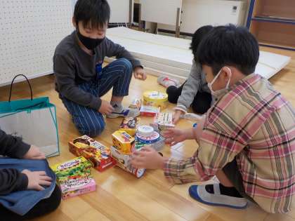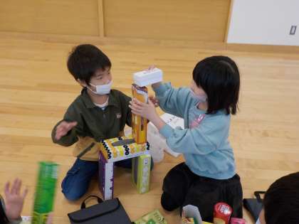 算数科では、「かたちあそび」の学習をしています。今日は、家から持ってきた空き箱や空き缶等を使って、いろいろなものをつくりました。「大きい箱から積むと、積みやすかったよ」「丸い形だからタイヤにして、トラックをつくってみたよ」等と、形の特徴を生かしていろいろなものをつくる姿が見られました。