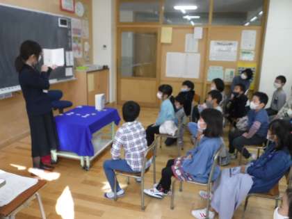富山市立図書館の方が来て下さいました。1組は「朝」、2組は「夜」に関する本の紹介を聞きました。紹介してもらった本をすぐに読む子供たちの姿が見られ、読書に親しむことができました。