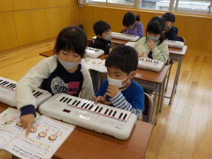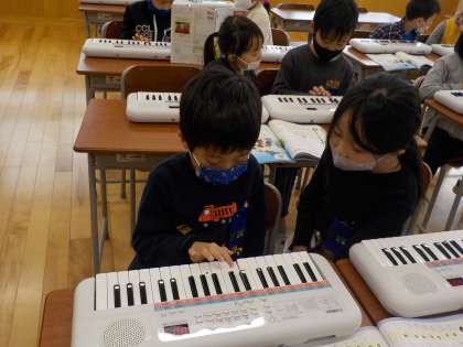 音楽科では、学習発表会で手拍子のリズムを披露した「とんくるりんぱんくるりん」のキーボード演奏に取り組んでいます。ペアで互いの演奏を聴き合いながら、「上手に弾けているね」や「ここは、真ん中の指を使うよ」等と声をかけている様子がありました。繰り返し練習をしていくうちに、最後には「最初より弾けるようになった」と笑顔になる子供もいました。