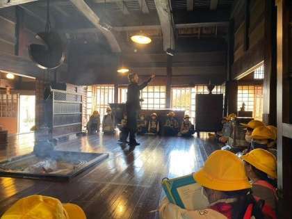 民芸合掌館では、かやぶき屋根の仕組みやよさについて説明を聞きました。中央にあるいろりには火がついていて、独特のにおいを体験しました。この煙が害虫や腐食を防ぐことを知り、昔の人の知恵に驚いていました。