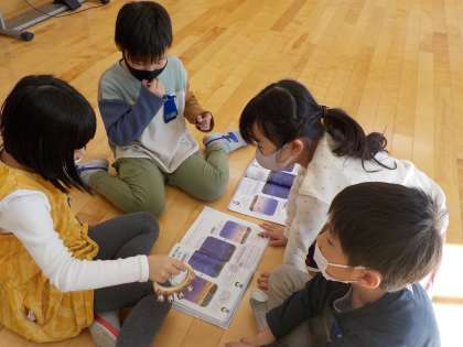 楽器を使った音楽づくりに取り組んでいます。星空の様子を思い浮かべながら「だんだんだから、少しずつ強く叩くといいかな」「遠くにあるから、やさしい音だといいね」等、音の出し方を考えていきました。