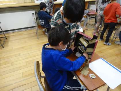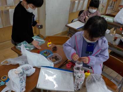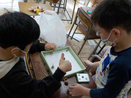秋の物を使ったおもちゃづくりをして、2年生に自分のつくったおもちゃで遊んでもらいました。また、2年生にもらったアドバイスを基にルールや遊び方、しかけ等の工夫を考え、友達に相談する姿も見られました。みんなが楽しめるようにと願いをもって活動に取り組んでいます。
