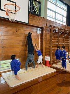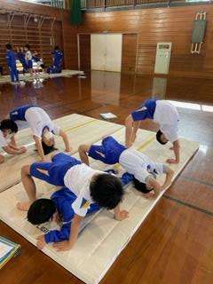学年でマット運動を学習しています。手や足で体を支えながら、いろいろな動きに挑戦しています。