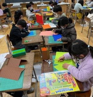 図画工作科の学習でカッターを使っています。自分の想像した形に切れるように、真剣な表情で活動しています。