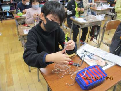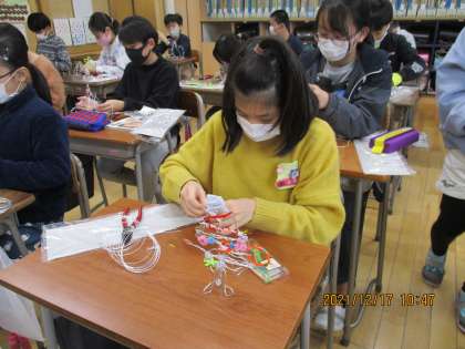 図画工作科の「立ち上がれ!ワイヤーアート」の学習では、針金を使ってツリーをつくりました。2種類の針金をうまく組み合わせて、自立するように工夫していました。針金やモールを使って飾り付け、にぎやかな個性あふれるいろいろな形のツリーができあがりました。