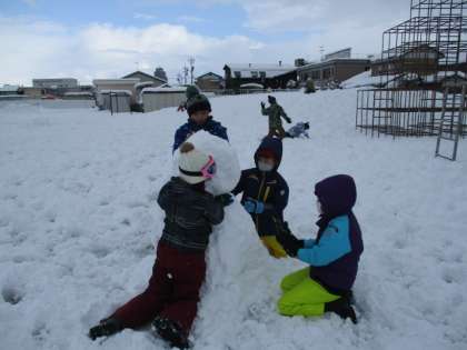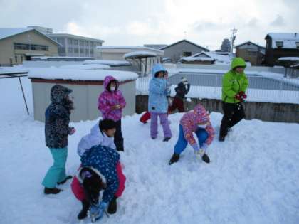 たくさんの雪が積もったグラウンドで雪だるまをつくったり、雪合戦をしたりして遊びました。久しぶりに友達と思い切り遊んだ子供たちは「ほんとに楽しい!!」ととびっきりの笑顔にあふれていました。途中、降ってきた雪を見て、「雪の結晶って本当にきれいだね」と感動している子供もいて心温まる楽しいひとときになりました。