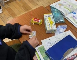 「これは鉄みたいだから電気を通しそうだよね」「軽くて木でできているから、電気を通さなさそうだな」と、これまでの理科で学んだことや触ったり持ったりした感じから、予想を立てながら実験に取り組んでいました。