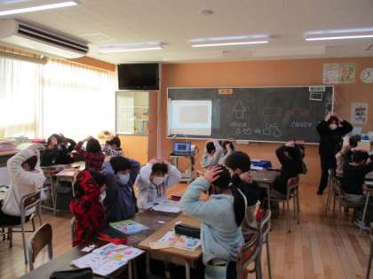 外国語の授業では、いろいろな色形カードでグリーティングカードをつくる活動を行います。活動の始めに、丸や三角等の英語の言い方をポインティングゲームで楽しみながら覚えました。次回、いろいろな形でどんなカードができるか楽しみです。
