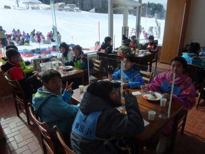 昼食はカレーライスを食べました。感染予防の観点から黙食を心がけて食べましたが、午後の部が楽しみな子供は、早々と外に出て時間が来るのを待っていました。午後も意欲的に取り組み、大自然でのスキーを満喫した子供たちです。