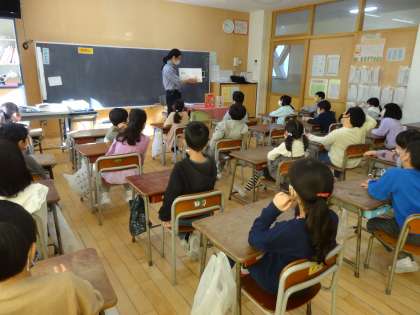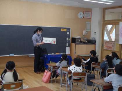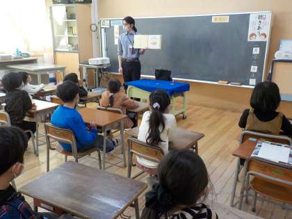富山市立図書館より図書館司書の方に学校に来ていただき、お話をしたり本の読み聞かせをしたりしていただきました。物語を聞きながら「えっ」と思わず声を出したり、「続きが気になる」と話したりするなど、子供たちはお話の世界に入って楽しんでいました。