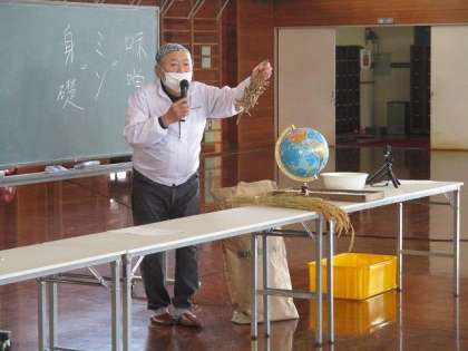 5時間目と6時間目の時間に、総合的な学習の時間でみそづくり体験をしました。新村こうじみそ商店の新村さんに来ていただき、味噌の作り方や発酵についてなど、様々なお話を聞きました。みそをかき混ぜるときには、「こんな触りごこちなんだ」「塩がたくさん入っているからしみるな」等と、混ぜるという体験を通して楽しんで学んでいました。