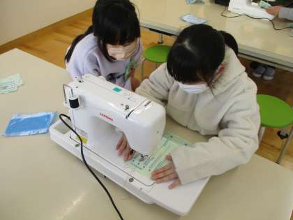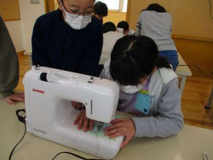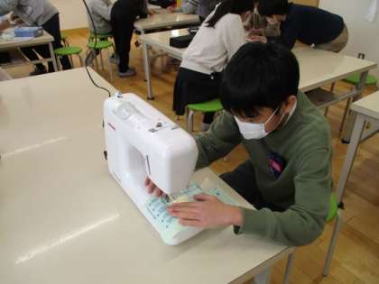 家庭科のミシンの学習では、上糸をかけたり下糸を出したりする練習をして、自分の思いどおりに針を進められるように頑張っています。