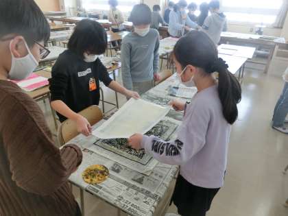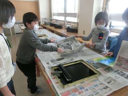 先週、背景を描いた面を印刷した両面版画ですが、今日は生き物を描いた面を印刷しました。印刷を終えるたびに「おお〜」という歓声が聞こえてきます。一生懸命に彫った作品が形になったことにうれしさを感じているのでしょう。グループの様子を見に行くと、「うまくいったね!」「上手!」と互いをほめ合う声も聞こえてきました。