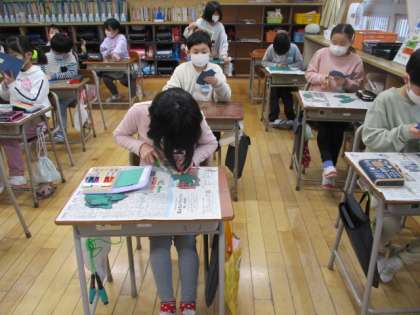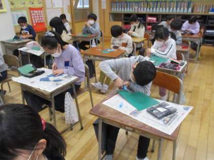 彫刻刀の使い方にも慣れてきて、版の完成が近付いてきました。ゴム版が思いのほか硬く、はさみで切り取るのも大変でしたが、根気強く丁寧に作業する子供たちでした。好きな色のインクを付けて刷るのが楽しみです。