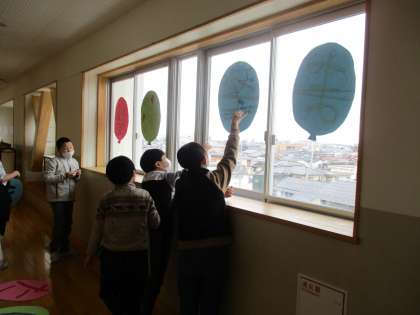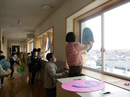 廊下の飾り付け係は、4階の窓に外から見るとメッセージが見える掲示をしました。