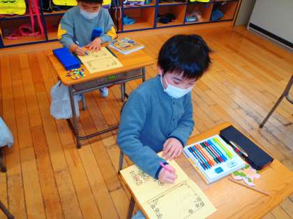 新しい1年生を迎えることを心待ちにしている子供たち。今日は、新しい1年生さんに向けて、カードをつくりました。受け取る1年生のことを考えてひらがなで丁寧に字を書いたり、きれいに色を塗ったりしてカードつくる姿がとてもすてきでした。