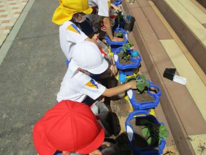 生活科では、野菜づくりに取り組みます。「大きく育つといいな」「これからお世話をがんばろう」と一人一人が思いを込めて大事に植えていました。