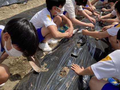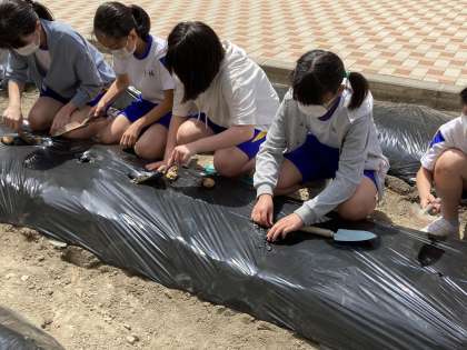 飼育栽培委員が中心となって、ジャガイモの種芋を植えました。育ったジャガイモは、理科「植物のからだのはたらき」の学習の際に実験で使う予定です。「どれくらいの大きさになるのかな」と成長を楽しみにしている子供たちでした。