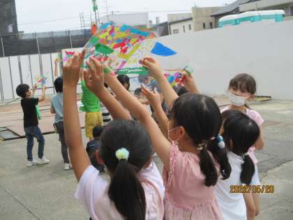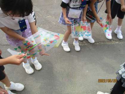 透明シールやペンで描いた絵を光りに当てて楽しみました。どのように光に当てると、きれいにうつるか考え、工夫していました。