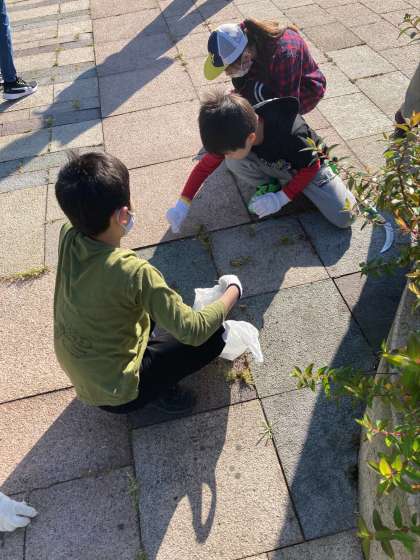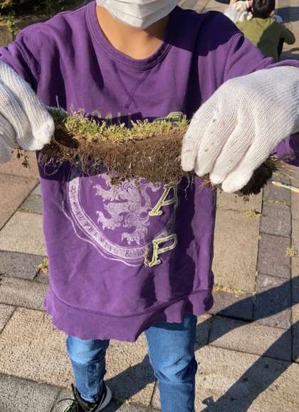 草むしりを農作物の収穫のように大喜びしている児童、参加している中学生の中には去年までの懐かしい顔もちらほら。