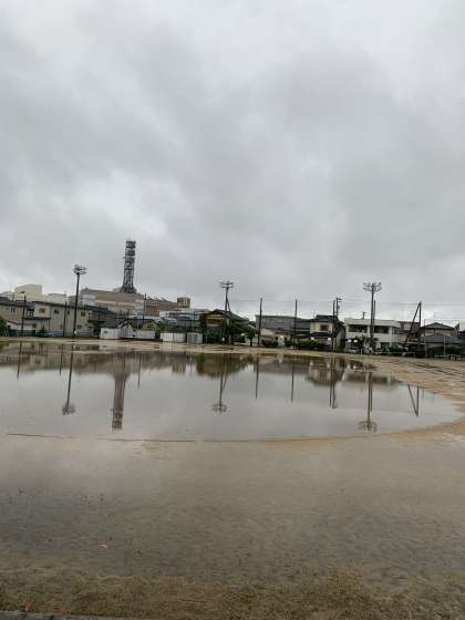 運動会前日、朝方の雨でグランドが湖となっていました。