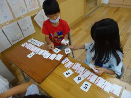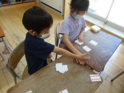 ペアの友達と一緒に数カードを使いながら、大きさ比べゲームをしました。1から10までの数字や図のカードを見せ合いながら、大きさ比べを楽しみながら学習していました。