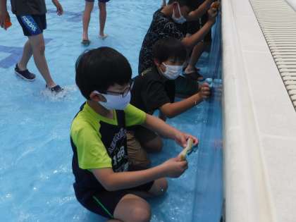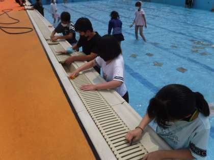 プール内や側溝には、一年間の汚れがたまっていました。6年生は、スポンジやたわしを使って汚れを取り、ピカピカにしていました。奥田っ子みんなが気持ちよくプールに入ることができるよう、一生懸命プール清掃に取り組んだ子供たちです。