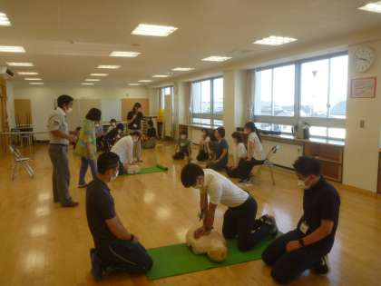 中分署署員、応急手当普及員の方々から、心停止になる状態や心肺蘇生法の手順等について、講義や実技演習を受けました。