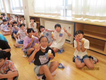 今日は横山冷菓株式会社で働いている横山さんのお話を聞きました。「アイスクリームを通じて幸せを提供したい」という思いで働く横山さんが、どのようなことを考えながら今の仕事に就いたのか、スライドを通して知ることができました。講演の中では、リモートで工場内を映していただき、アイスクリームの製造過程についても詳しく知ることができました。最後に「塩ソフト」をいただき、子供たちは幸せそうに食べていました。