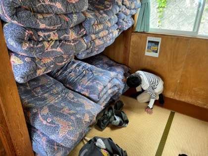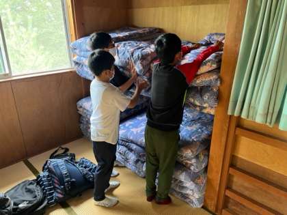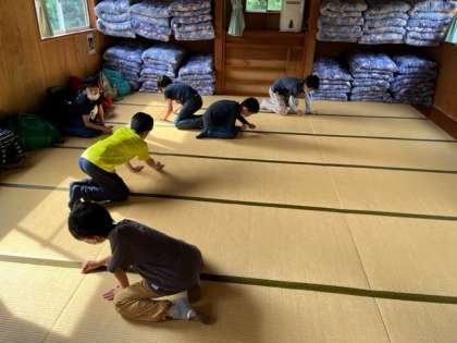 「来た時よりも美しく」するために、布団を綺麗に畳んだりゴミを拾ったりするなど、手分けをして隅々まで掃除に取り組んでいます。