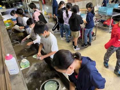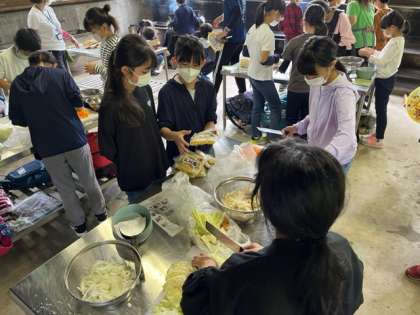 食器等を綺麗に洗う。食べやすいサイズに野菜を切る。火おこしをする。など、美味しい焼きそばになるように、それぞれが仕事を分担して頑張っています。