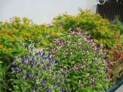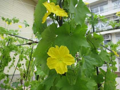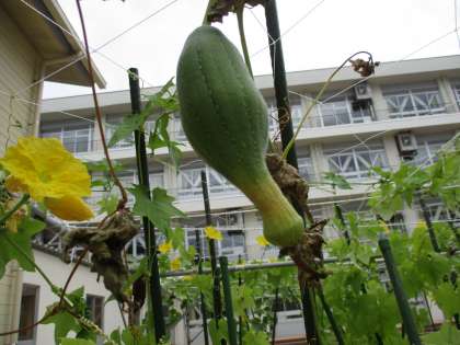 こんなに暑いにもかかわらず、学校の中庭のヘチマや前庭の花は、ぐんぐん成長しています。