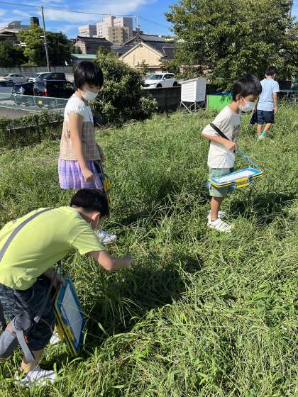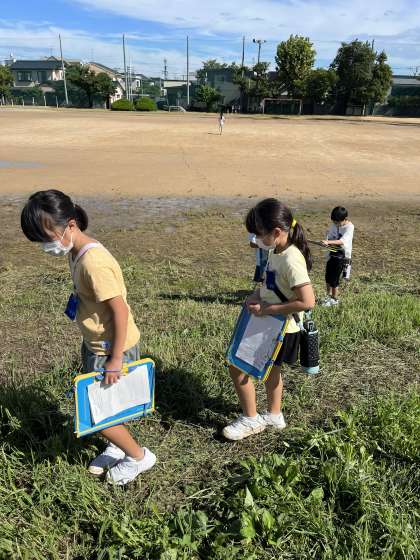 理科では、昆虫等の動物がどのような所をすみかにしているのかをグラウンドで観察しました。観察前には、「食べ物がある所に住んでいるのではないかな」「敵に食べられないように昆虫の体の色と似ている場所に住んでいるのではないかな」等の予想が聞かれました。友達と考えを伝え合ったり、観察したりして、楽しみながら昆虫について調べている子供たちです。