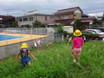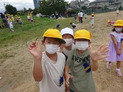 虫が好きな子供たちは細かく観察したり、友達と発見したことを伝え合ったりしました。虫が苦手な子供たちも、アリやテントウムシを離れた場所から観察したり、少しでも触れ合おうと虫に手を伸ばしたりしました。晴天の中、元気に外を走り回り、自然のよさに触れ合うことで笑顔があふれた素敵な時間となりました。