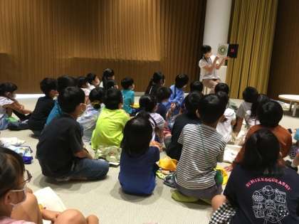 次は、本の読み聞かせ。おもしろい果物の本でした。