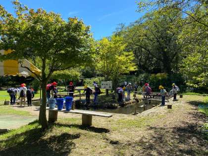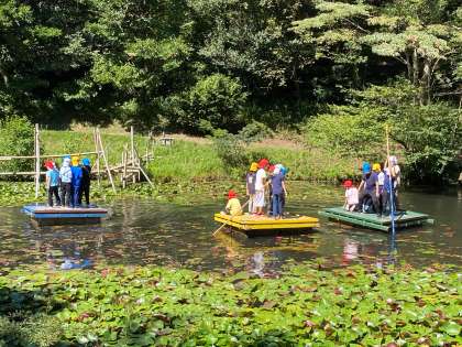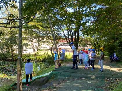 午前中のプログラムは、池遊びに変更して行なっています。ターザンロープやいかだ漕ぎ、ザリガニ釣りに取り組んでいます。自然の中での活動を満喫しています。