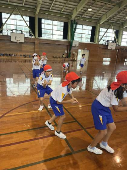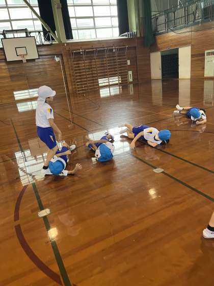 体育科では、表現運動の学習をしてます。今日は、色団ごとに列になり、先頭の友達の動きをまねしながら動く活動をしました。床を寝転がったり、大の字にジャンプしたりして様々な動きを楽しむ子供たちでした。