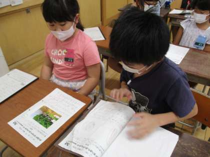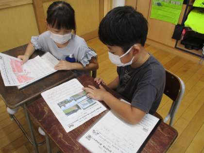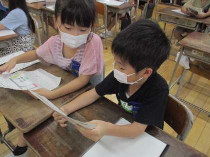 夏休み中に見付けた奥田の「きらきら」を聴き合いました。子供たちは「きらきら」を聴き合う中で、「もっときらきらを見付けたいな」「インタビューをしたり実際に行ったりしたら、もっと知ることができそうだ」「自分の見付けたきらきらをたくさんの人に伝えたいな」等と、これからどのように学んでいきたいのかを考えていました。