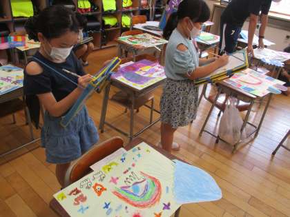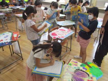 図画工作科で「ふしぎなたまご」の学習をしました。友達のつくった作品を見て「この色の使い方がすてきだね」「このたまごから、おもしろい世界が広がっていて、工夫してあるな」等と、よさや面白さを見付けながら鑑賞しました。一人一人が思い描いた「ふしぎなたまご」から生まれた世界を楽しむ時間となったようです。