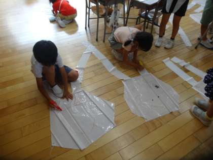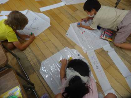 「かぜとなかよし」の学習で行う凧揚げに向けて、凧をつくりました。自分の似顔絵やオリジナルキャラクターを描き、思い思いの凧を完成させることができました。