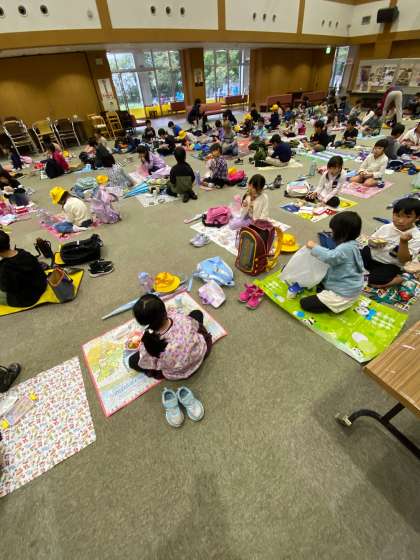 たくさん歩いて、お腹ぺこぺこになった子供たちは、予定より少し早く昼食をとっています。『先生、弁当を見て』と、とても美味しそうな弁当を見せてくれました。美味しそうに食べている表情はとても幸せそうです。