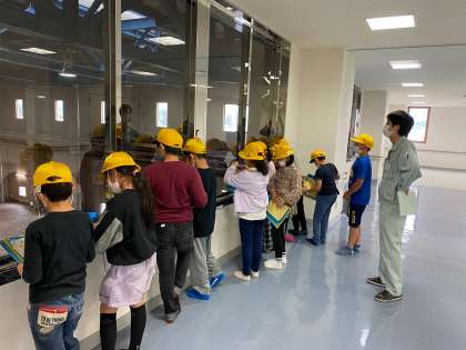 ごみ収集車がごみを投入するプラットフォーム、ごみをためておくごみピット、工場内の機械を操作・監視する中央制御室遠見学しました。興味津々で見ています。