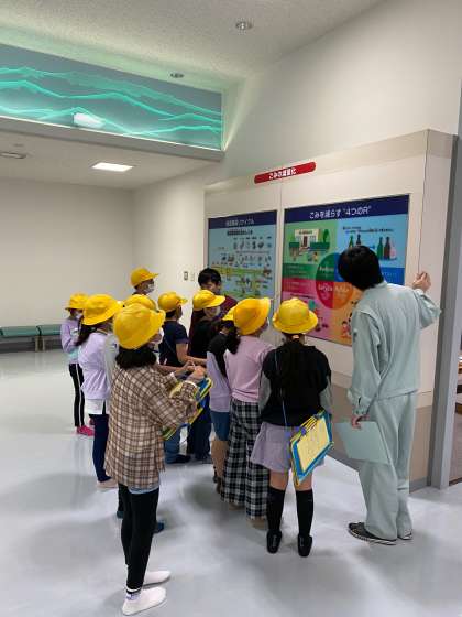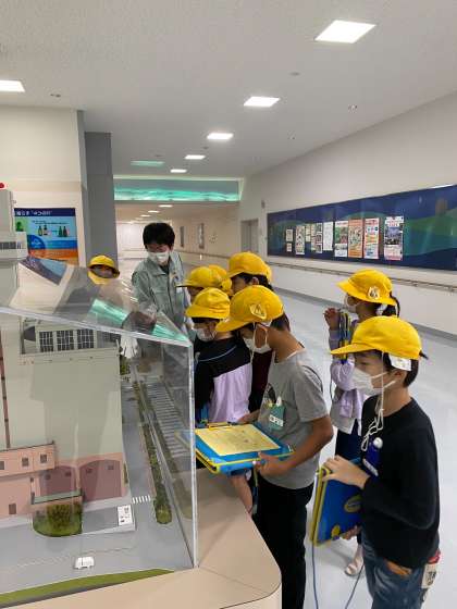 クリーンセンターの模型やごみに関する資料の説明を聞いたり、見たりしました。真剣に取り組んでいまさ。